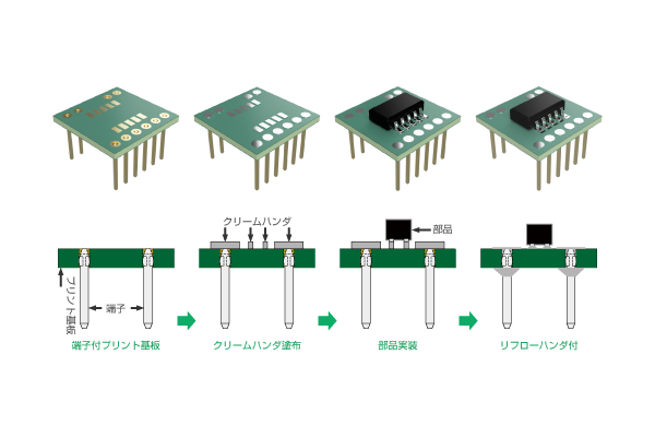 端子付プリント基板では、部品実装面に飛び出さないように、端子を圧入しておくことで、マウンターでの部品実装後に、部品と端子を同時にリフローハンダ付処理することが可能になります。(基板の厚みや端子の仕様などによっては、本ハンダ付け工程イメージが適用できないことがあります。)