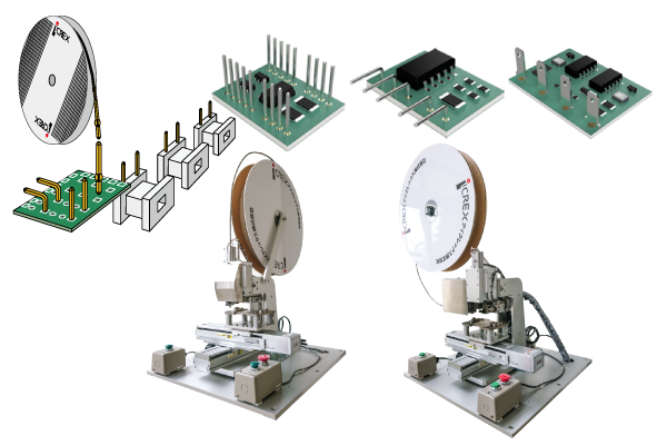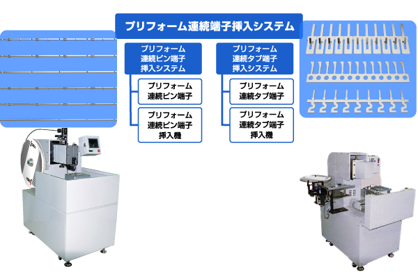 連続ピン端子挿入システムと連続タブ端子挿入システムがあり、どちらもプリント基板やボビンなど成形品に端子を直接挿入するシステムです。