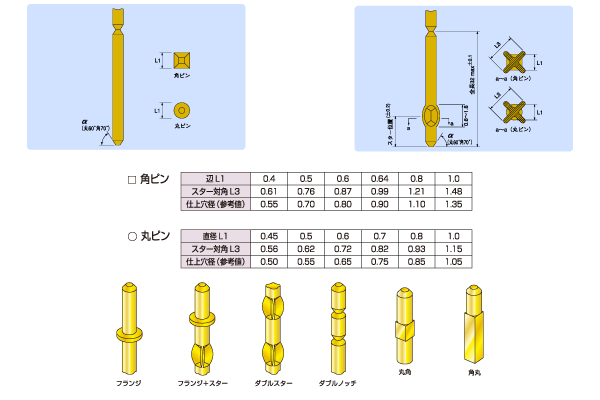 などの種類がございます。また角ピンや丸ピンにフランジ(ツバ)を付けた端子も可能です。