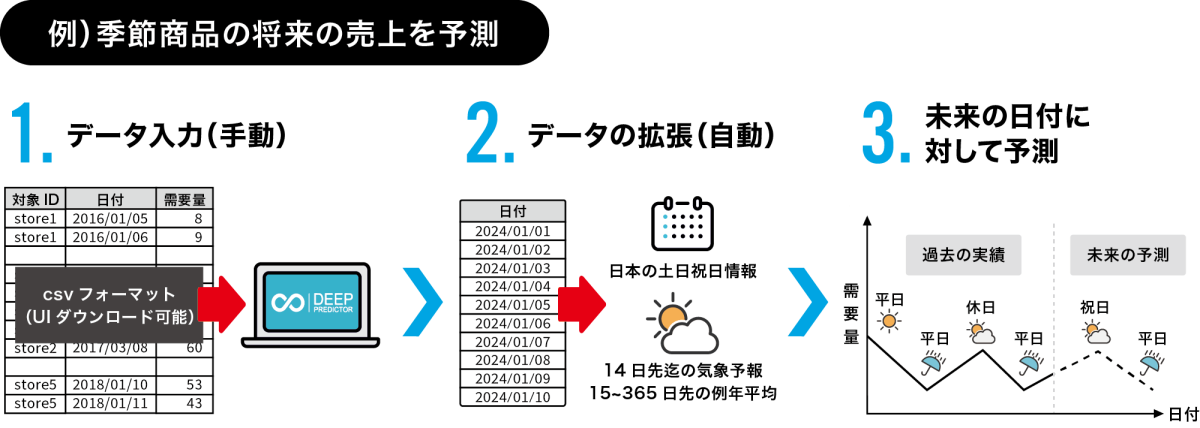 「Deep Predictor」では、販売数・出荷数・発注数・消費数・在庫数 といったデータを数値で可視化するだけでなく、天候や季節性、販路ごとの動き、需要の変動要因まで考慮して予測を行います。