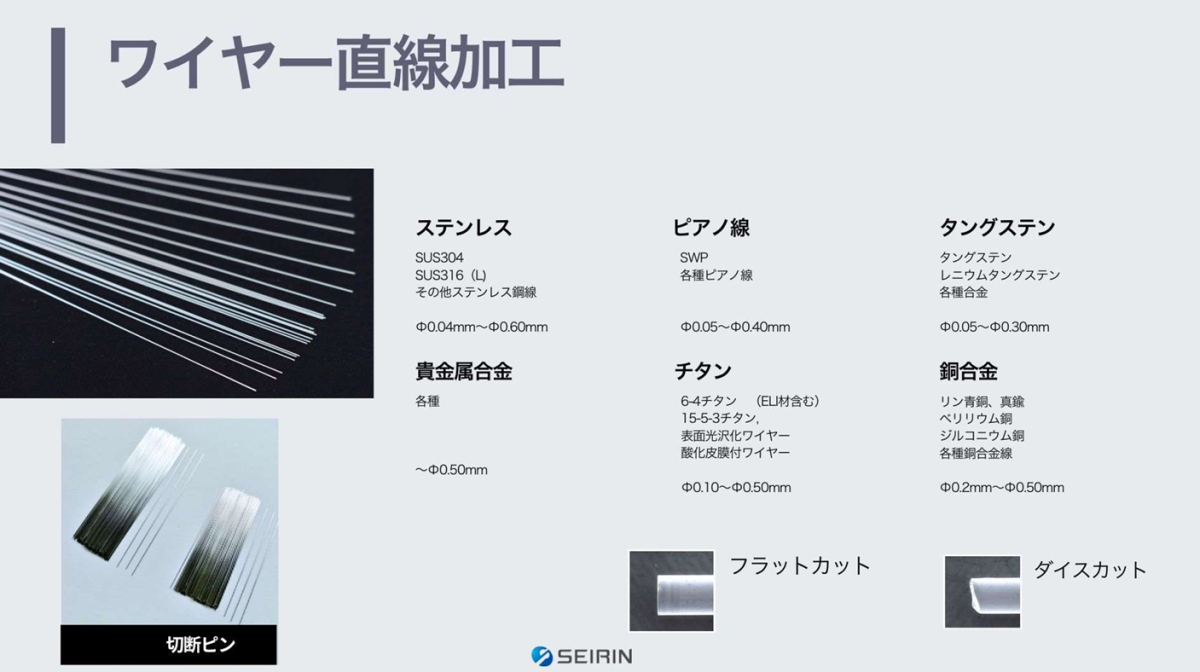 外径Φ0.04~Φ060mmといった極細径においても、ボビンに巻かれたワイヤーの癖を取り 除き、真っ直ぐな線形を保つ「直線加工」が可能です。これにより、微小部品への安定した 組み込みや、高精度な位置決めが求められる製品への応用に対応できます。当社は、針状部 品製造の経験を活かし、量産時にも高い加工安定性を実現しています。