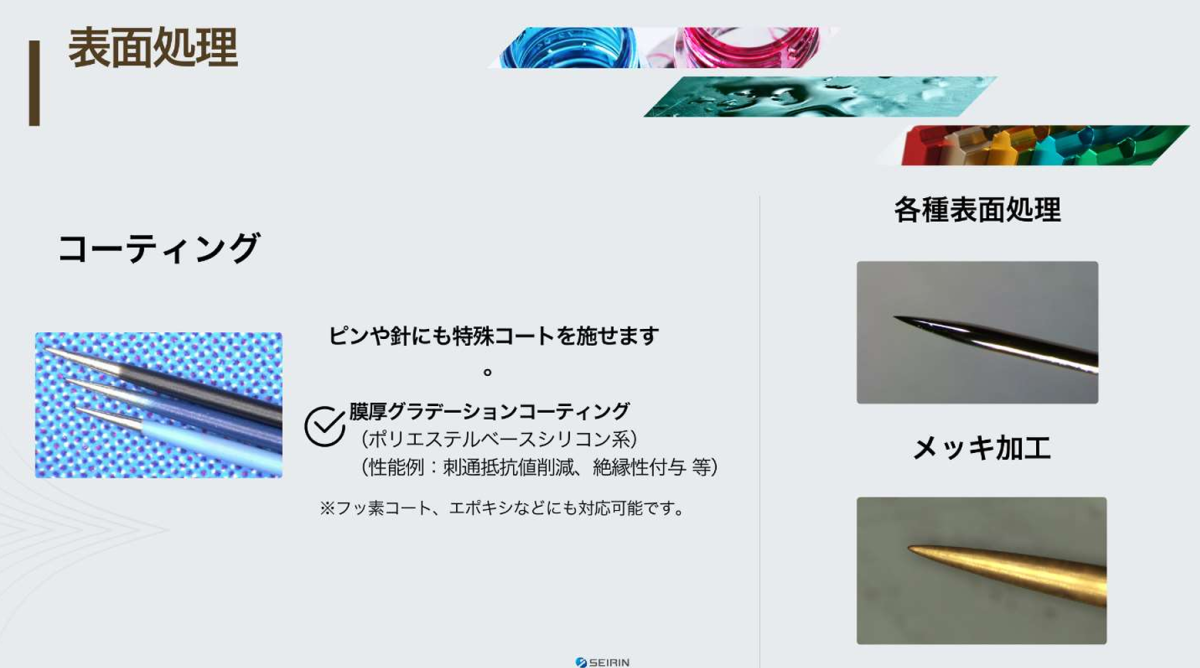 当社の鍼灸針では、人体への安全性と使用時の滑らかさを両立するため、特殊な表面コーテ ィングを施しています。この技術は社内処理で完結しており、医療用途に耐える品質管理体 制のもとで運用されています。 一方、鍼灸針以外の製品へのコーティングについては、用途や要求性能に応じて協力会社と 連携し、最適な処理をご提案する体制を整えています。必要に応じて絶縁性や潤滑性を付与 する対応も可能です。 (※詳細は当社Webサイトの該当ページをご参照ください:コーティング技術)