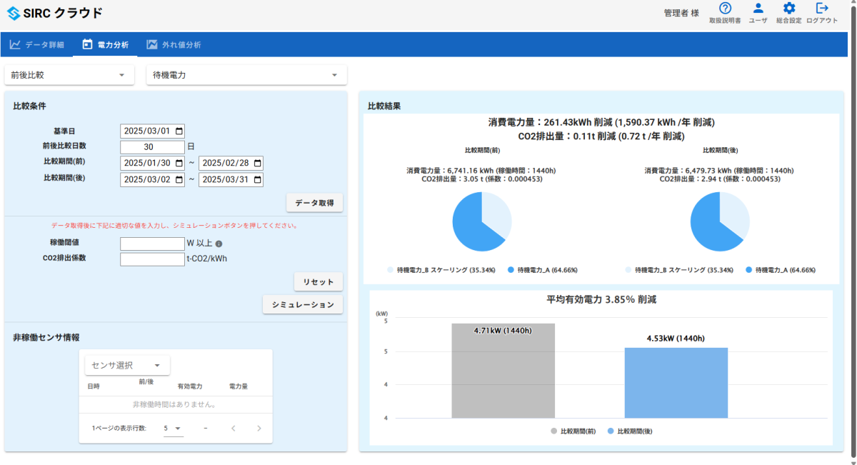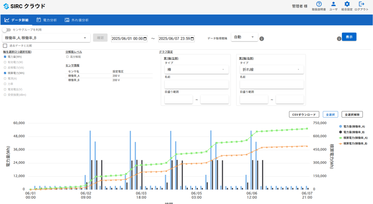 SIRCクラウドは、電力センサで計測したデータをリアルタイムに可視化し、グラフや数値でわかりやすく整理・分析できるクラウドサービスです。