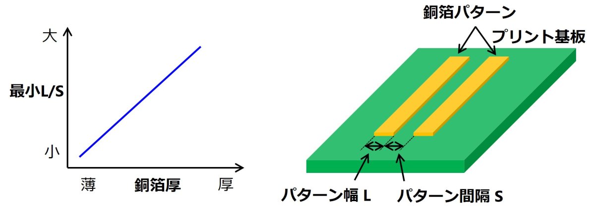 一般的にプリント基板の銅箔は厚くなるほど最小パターン幅/最小パターン間隔(L/S)が大きくなり、狭ピッチ部品の実装や高密度配線が難しくなります。
