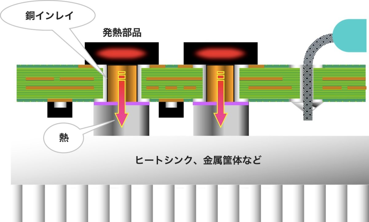 基板裏面に設けたヒートシンクと銅インレイを接続することで、部品から銅インレイ、そしてヒートシンクへと効率的に熱を逃がす経路を形成します。