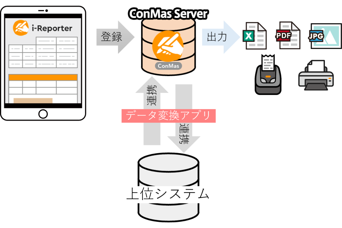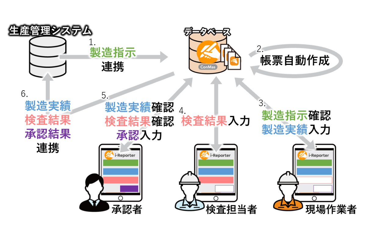 製造現場では、製造実績データをタブレット電子帳票「i-Reporter」に入力し、基幹システムへ自動で反映する仕組みを構築できます。当社が開発した「データ変換アプリ」により、現場での入力完了と同時に、品質管理・生産管理システムへデータが送信されます。