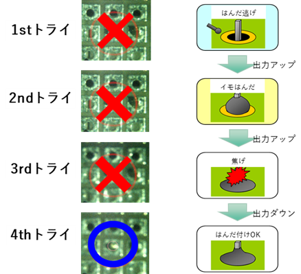 ただし、レーザはんだ付けにも弱点がありました。レーザは材料の放射率特性に依存して発熱するため、昇温ムラが発生しがち。出力制御の設定が適切でない場合は過昇温による基板の焦げを招くこともあります。さらに、加工点の熱容量の違いに合わせて出力を都度調整する条件出しの煩雑さが、量産立ち上げのボトルネックでした。