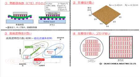ガラスは平滑な表面形状、熱的安定性、電気絶縁性、透明性などの特性を有しており、高性能化を求める電子基板材料として適している。この基材をインターポーザやコア材に導入することで、以下のメリットが挙げられる。