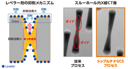 次世代半導体パッケージ基板のコア材料として注目されるガラス基板へのスルーホールフィリング用硫酸銅めっきとして「トップルチナGCSシリーズ」を用いることで、小径かつ高アスペクト比のスルーホールをボイドフリーかつ高速でフィリングすることが可能になった。