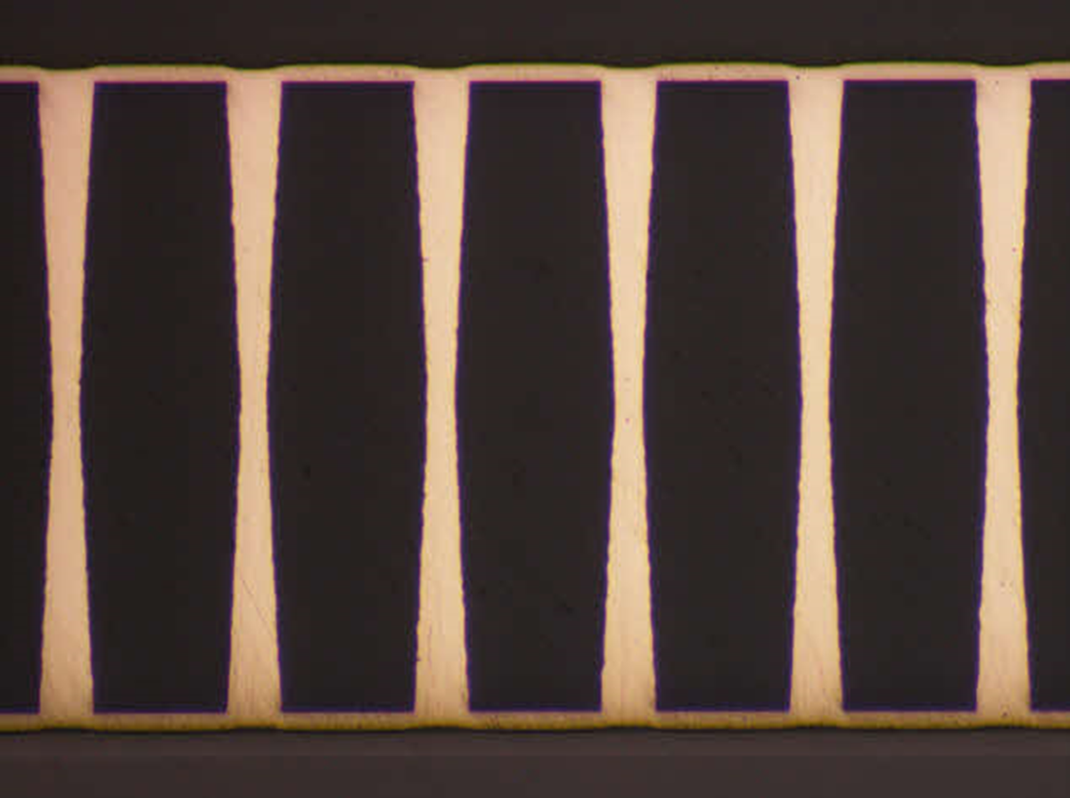 近年のガラスコア基板は200μm以下のピッチでスルーホールを設計されることが多い。トップルチナGCSシリーズの実施例を示す。板厚0.8mm, 直径80μmのTGV基板のスルーホールフィリングに必要なめっき時間は、直流電解と比べて3分の1に短縮できる。また、板厚1.0mm, 直径90μmのTGV基板でめっきを施したところ、ボイドフリーでフィリングできることを確認した。