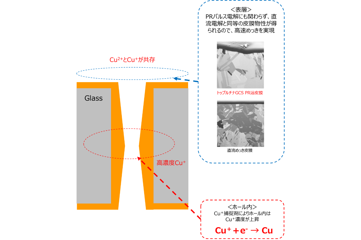当社は2種類のめっき液による2段階のめっきによって実現を目指し、1段階目めっき用としてPRパルス電解用硫酸銅めっき添加剤の「トップルチナGCS PR」、2段階目めっき用として直流電解用硫酸銅めっき添加剤の「トップルチナGCS TF」を開発した。