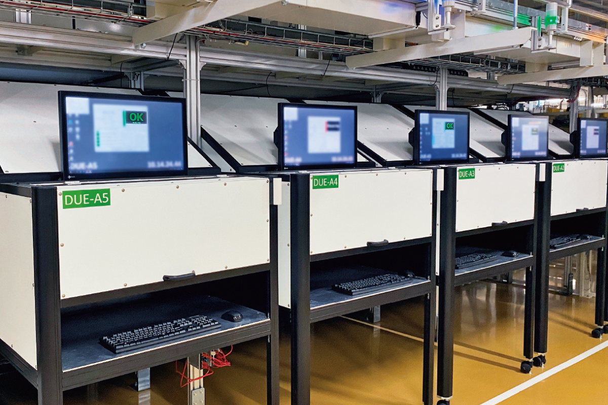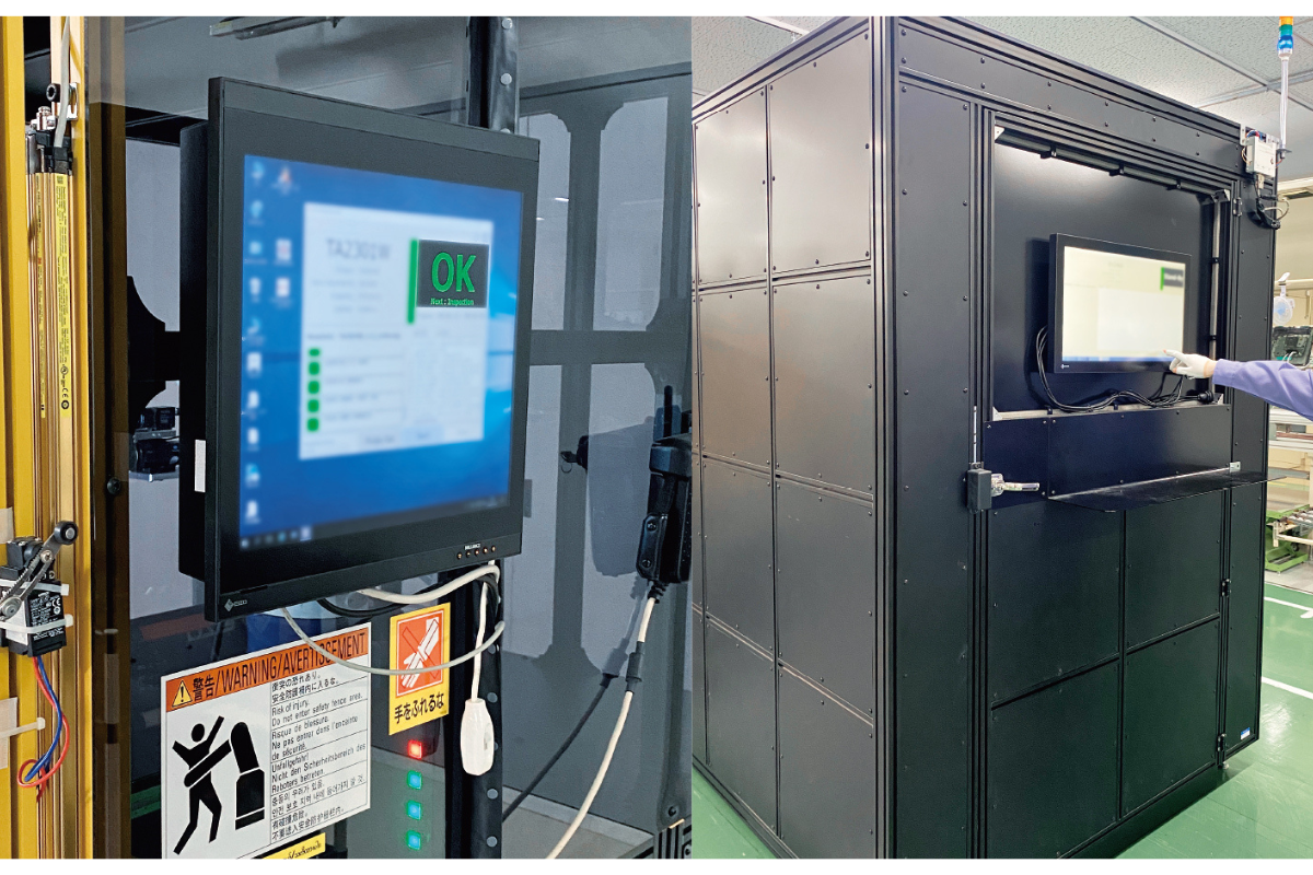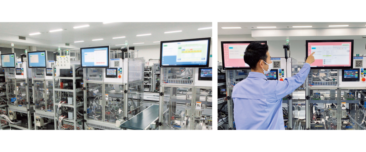 また、ロボットやAIを活用し自動化を進める調整・検査工程においても、複数箇所に自社のタッチパネルモニターを採用しています。進捗の見える化を行うことで、効率化を図っています。