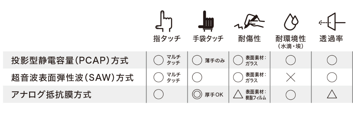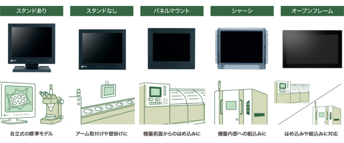 EIZOのタッチパネルモニターは用途に合わせて3種類のタッチ方式からお選びいただけます。また、サイズ展開も豊富です。産業機器への取付けに適したキャビネットバリエーションも用意しているので、機器内部への組込みや、機器前面からのはめ込みにも対応可能です。