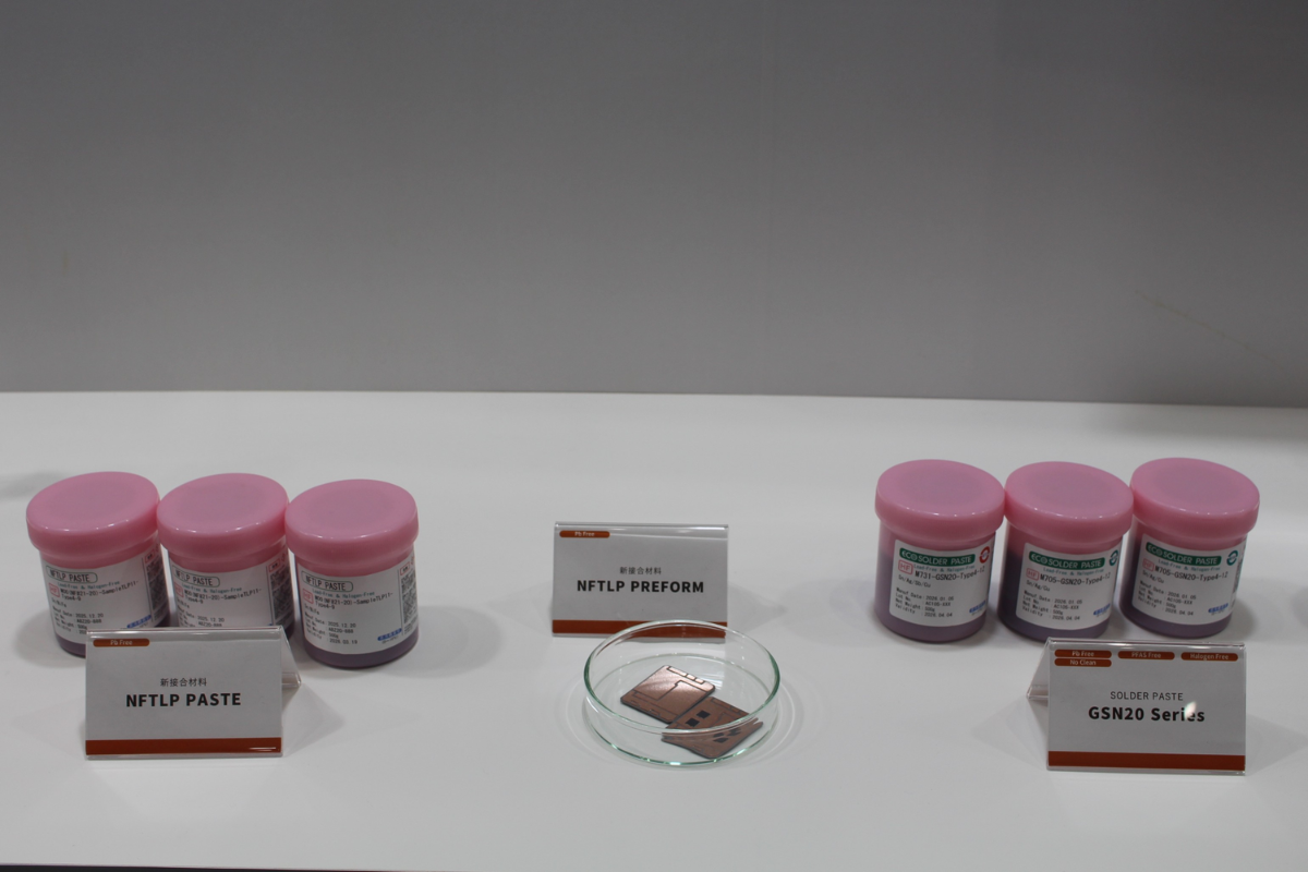 この装置と組み合わせる推奨材料として、フラックスが完全に揮発し優れたボイド低減効果を持つ「SOLDER PASTE GSN20 series」、700℃以上の耐熱性と優れた熱伝動性を持つ「NFTLP PREFORM/PASTE」も紹介した。