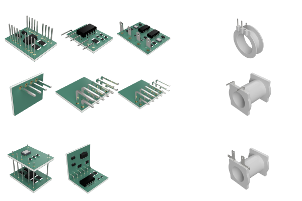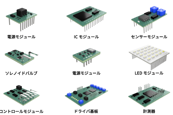 プリント基板同士をつなぐ電気的接続用の機構部品として、またボビンの巻線カラゲ用端子としてなど、多くのお客様に採用され、高い評価を得ています。