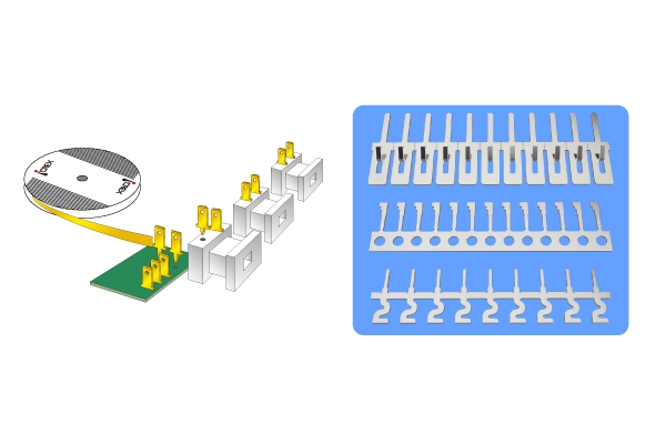 プレス加工にて製作された連鎖状のタブ端子を端子挿入機で、プリント基板やボビンにダイレクトに挿入するシステムです。