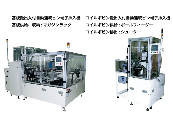 「プリフォーム連続ピン端子挿入システム」と「プリフォーム連続タブ端子挿入システム」があり、どちらもプリント基板やボビンなど成形品に端子を直接挿入します。