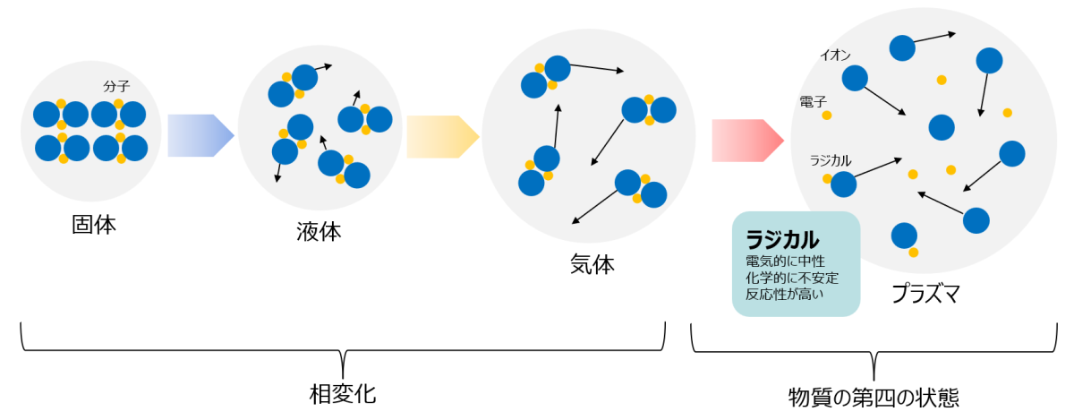 このように与えられたエネルギーによって物質が固体、液体、気体へと変化することを相変化と呼び、気体に更に外部エネルギー(熱、電力など)を加えると分子中の電子が電離し、電子・イオン・中性粒子・ラジカルなどが共存する状態となる。この状態を「プラズマ」と呼ぶ。