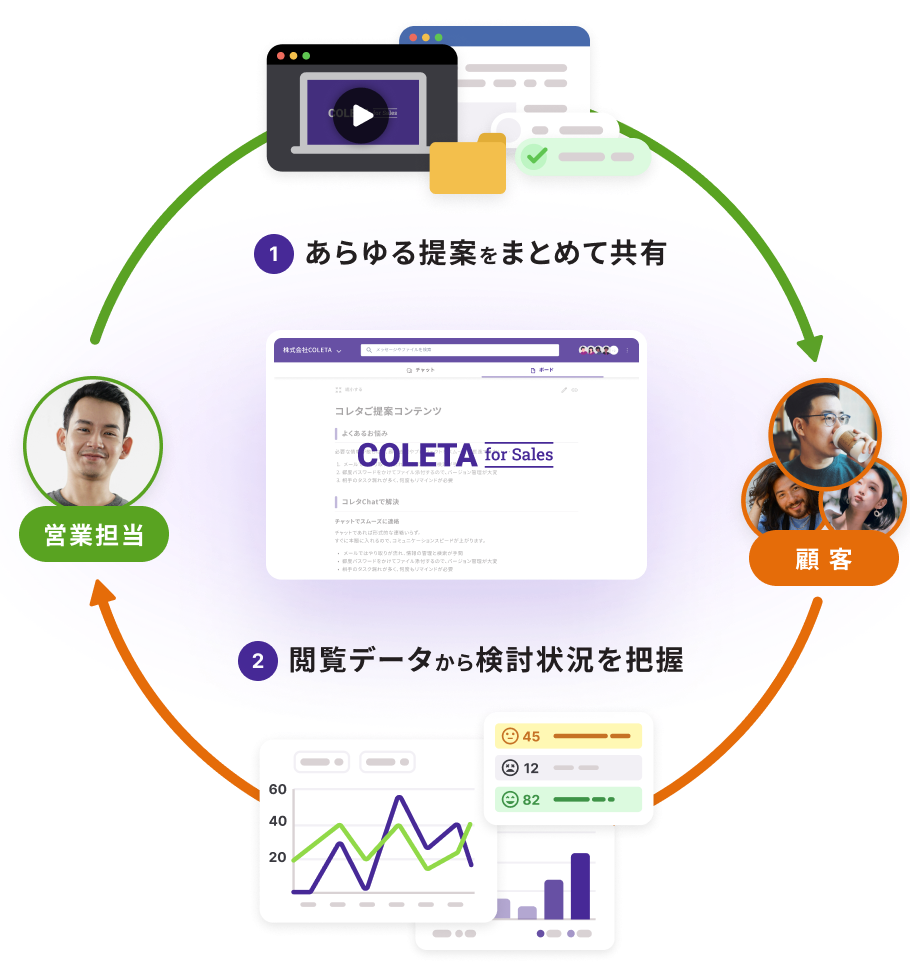 コレタ(https://www.coleta.jp/)は営業活動をデジタル化し、提案から受注までのプロセスを可視化、標準化する「デジタルセールスルーム (DSR)」です。デジタルセールスルームは主に以下の特徴を持ちます。