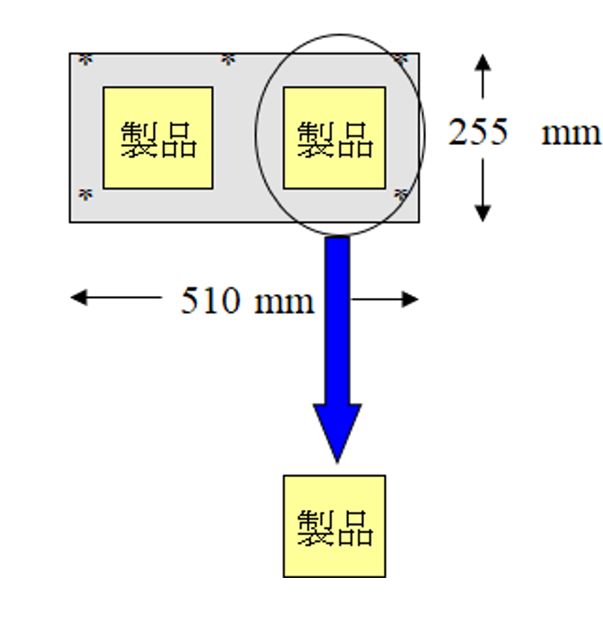 プリント配線板のワーキングサイズ (255 × 510mm)で、1mサイズの定尺から製品が16個生産できた例であり、プリント配線板の製品サイズによって多面取りの個数が異なってくる。