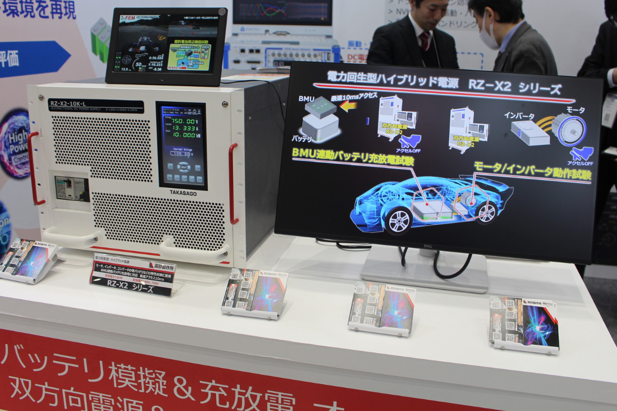 高砂製作所は、電動化とバッテリー評価の高度化に対応した電力回生型ハイブリッド電源「RZ‑X2シリーズ」を紹介した。双方向直流電源と充放電電源の機能を1台に統合しており、二次電池の充放電試験やモーター・インバーターの特性試験など、多様な評価用途に対応する。